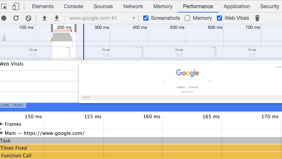 개발자 도구를 열고 Performance 탭에 들어가 녹화를 시작하고 여러 가지 동작을 수행한 후 녹화 정지 버튼을 누르면 전반적인 지표들을 아래와 같이 볼 수 있다. 이를 통해 웹 페이지 로드(load) 시점에서 일어나는 블로킹(Blocking)을 해결하고 시각적으로 LCP, CLS 지점들을 확인해 볼 수 있다.