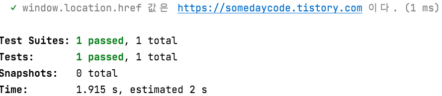 test('window.location.href 값은 https://somedaycode.tistory.com 이다.', () => {